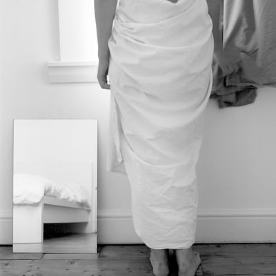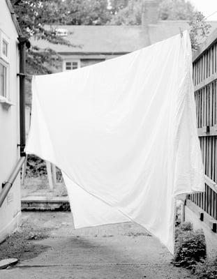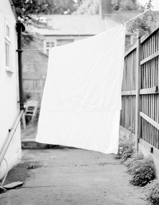 Die Künstlerin nutzt die Bettwäsche zum Schlafen, das Leintuch als Bekleidung. Nach der Wäsche fotografiert sie diese regelmässig von ihrem Arbeitsplatz mit Blick auf den Garten auf de Wäscheleine.