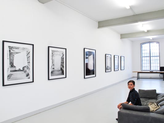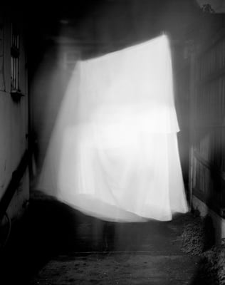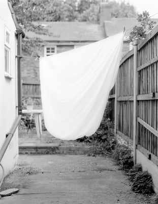 The project is photographed with the most domestic camera in the artist‘s possession: a 4x5“ Linhoff & equipment which is too heavy and bulky for her to carry around, thus limiting her operating range: the house. While asking questions about a sense of belonging the female artist unexpectedly finds herself technically trapped at the traditonally associated space for women. From the kitchen door she regularly is taking photographs of the sheets which are marking her presence.